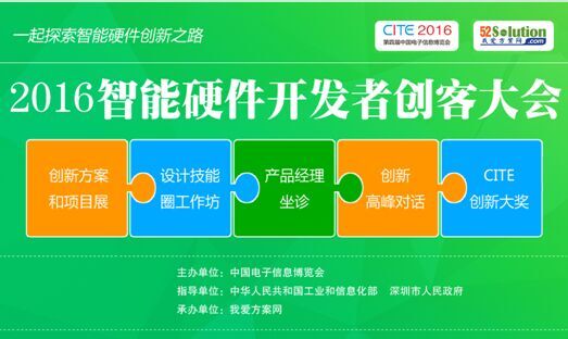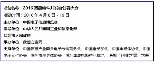 2016智能硬件開發(fā)者創(chuàng)客大會由我愛方案網(wǎng)承辦是第四屆中國電子信息博覽會(CITE2016)的核心活動。CITE2016將于4月8日-10日在深圳會展中心舉行。CITE2016由中華人民共和國工業(yè)和信息化部、深圳市人民政府重磅打造,是具有國際影響力的電子信息產(chǎn)業(yè)年度盛會!一起來嗨!讓你的才華和項目通過CITE和我愛方案網(wǎng)充分曝光!
