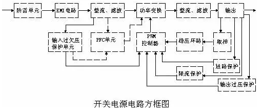 開關電源的主要電路是由輸入電磁干擾濾波器(EMI)、整流濾波電路、功率變換電路、PWM控制器電路、輸出整流濾波電路組成。輔助電路有輸入過欠壓保護電路、輸出過欠壓保護電路、輸出過流保護電路、輸出短路保護電路等。