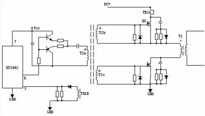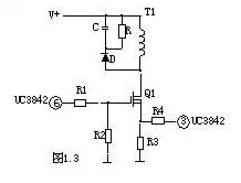 輸出電路短路或電流過大,TR1次級線圈感應的電壓就越高,當UC3842③腳超過1伏,UC3842停止工作,周而復始,當短路或過載消失,電路自行恢復。