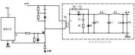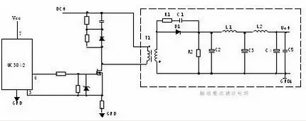 T1為開關變壓器,其初極和次極的相位同相。D1為整流二極管,D2為續(xù)流二極管,R1、C1、R2、C2為削尖峰電路。L1為續(xù)流電感,C4、L2、C5組成π型濾波器。
