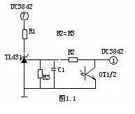 當輸出電路短路或過流,變壓器原邊電流增大,R3兩端電壓降增大,③腳電壓升高,UC3842⑥腳輸出占空比逐漸增大,③腳電壓超過1V時,UC3842關閉無輸出。