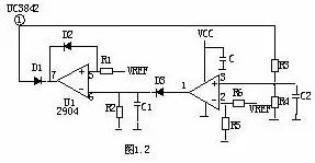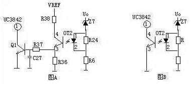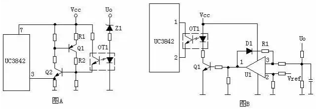 圖A的工作原理是,當輸出電壓Uo升高,穩(wěn)壓管導通,光耦導通,Q2基極得電導通,由于Q2的導通Q1基極電壓降低也導通,Vcc電壓經(jīng)R1、Q1、 R2使Q2始終導通,UC3842③腳始終是高電平而停止工作。在圖B中,UO升高U1③腳電壓升高,①腳輸出高電平,由于D1、R1的存在,U1①腳始 終輸出高電平Q1始終導通,UC3842①腳始終是低電平而停止工作。