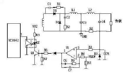 當輸出U0升高,經(jīng)取樣電阻R7、R8、R10、VR1分壓后,U1③腳電壓升高,當其超過U1②腳基準電壓后U1①腳輸出高電平,使Q1導通,光耦 OT1發(fā)光二極管發(fā)光,光電三極管導通,UC3842①腳電位相應變低,從而改變U1⑥腳輸出占空比減小,U0降低。當輸出U0降低時,U1③腳電壓降 低,當其低過U1②腳基準電壓后U1①腳輸出低電平,Q1不導通,光耦OT1發(fā)光二極管不發(fā)光,光電三極管不導通,UC3842①腳電位升高,從而改變 U1⑥腳輸出占空比增大,U0降低。周而復始,從而使輸出電壓保持穩(wěn)定。調節(jié)VR1可改變輸出電壓值。