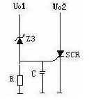 如上圖,當Uo1輸出升高,穩(wěn)壓管(Z3)擊穿導通,可控硅(SCR1)的控制端得到觸發(fā)電壓,因此可控硅導通。Uo2電壓對地短路,過流保護電路或短 路保護電路就會工作,停止整個電源電路的工作。當輸出過壓現(xiàn)象排除,可控硅的控制端觸發(fā)電壓通過R對地泄放,可控硅恢復斷開狀態(tài)。
