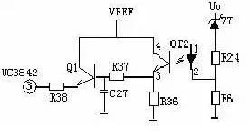輸出限壓保護電路如下圖,當輸出電壓升高,穩(wěn)壓管導通光耦導通,Q1基極有驅動電壓而道通,UC3842③電壓升高,輸出降低,穩(wěn)壓管不導通,UC3842③電壓降低,輸出電壓升高。周而復始,輸出電壓將穩(wěn)定在一范圍內(取決于穩(wěn)壓管的穩(wěn)壓值)。