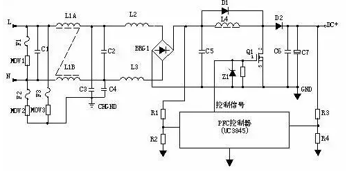 輸入電壓經(jīng)L1、L2、L3等組成的EMI濾波器,BRG1整流一路送PFC電感,另一路經(jīng)R1、R2分壓后送入PFC控制器作為輸入電壓的取樣,用以 調整控制信號的占空比,即改變Q1的導通和關斷時間,穩(wěn)定PFC輸出電壓。L4是PFC電感,它在Q1導通時儲存能量,在Q1關斷時施放能量。D1是啟動 二極管。D2是PFC整流二極管,C6、C7濾波。PFC電壓一路送后級電路,另一路經(jīng)R3、R4分壓后送入PFC控制器作為PFC輸出電壓的取樣,用以 調整控制信號的占空比,穩(wěn)定PFC輸出電壓。