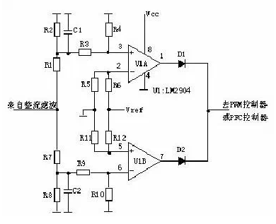 AC輸入和DC輸入的開關電源的輸入過欠壓保護原理大致相同。保護電路的取樣電壓均來自輸入濾波后的電壓。取樣電壓分為兩路,一路經(jīng)R1、R2、R3、 R4分壓后輸入比較器3腳,如取樣電壓高于2腳基準電壓,比較器1腳輸出高電平去控制主控制器使其關斷,電源無輸出。另一路經(jīng)R7、R8、R9、R10分 壓后輸入比較器6腳,如取樣電壓低于5腳基準電壓,比較器7腳輸出高電平去控制主控制器使其關斷,電源無輸出。