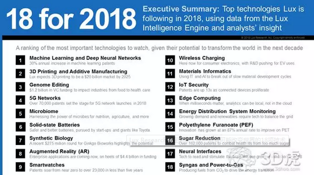 2)3D打印和增材制造:Lux預(yù)計到2025年3D打印將達(dá)到200億美元的市場。