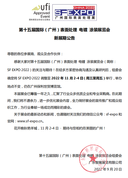 尊敬的各位參展商、觀眾及合作伙伴: 感謝大家對第十五屆國際(廣州)表面處理 電鍍 涂裝展覽會(簡稱:SF EXPO 2022)的關(guān)注與期待!在經(jīng)多方緊密協(xié)商溝通及認(rèn)真研判后,組委會確定將SF EXPO 2022調(diào)整至2022年11月2-4日(周三至周五)舉行,舉辦地點(diǎn)不變,仍在廣州保利世貿(mào)博覽館。 本屆展會已籌備一年之久,匯聚了行業(yè)眾多優(yōu)質(zhì)企業(yè)和專業(yè)采購商。在此期間,我們將不遺余力,進(jìn)一步優(yōu)化展會內(nèi)容,全力做好展會的宣傳推廣和觀眾組織工作,為行業(yè)奉獻(xiàn)一場成功而精彩的盛會。 關(guān)于展會的最新動態(tài)和新聞,也請隨時(shí)關(guān)注我們的微信公眾號:sf-expo和官網(wǎng):www.sf-expo.cn。 花開晚秋艷羊城,11月2-4日,期待與您相約在美麗的廣州!